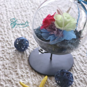 地球儀型のガラスの器をプリザーブドフラワーで彩る、